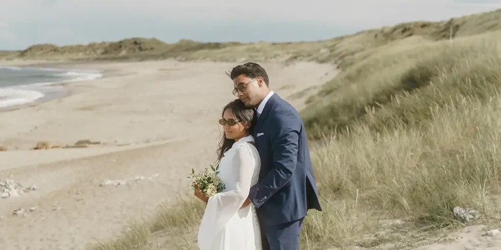 Una coppia straniera posa per delle foto dopo il matrimonio su una spiaggia danese (Yana Adamova/Weddings in Denmark)