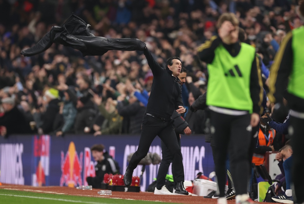 L’esultanza di Emery durante la recente vittoria dell’Aston Villa contro il Manchester United (Catherine Ivill – AMA/Getty Images)