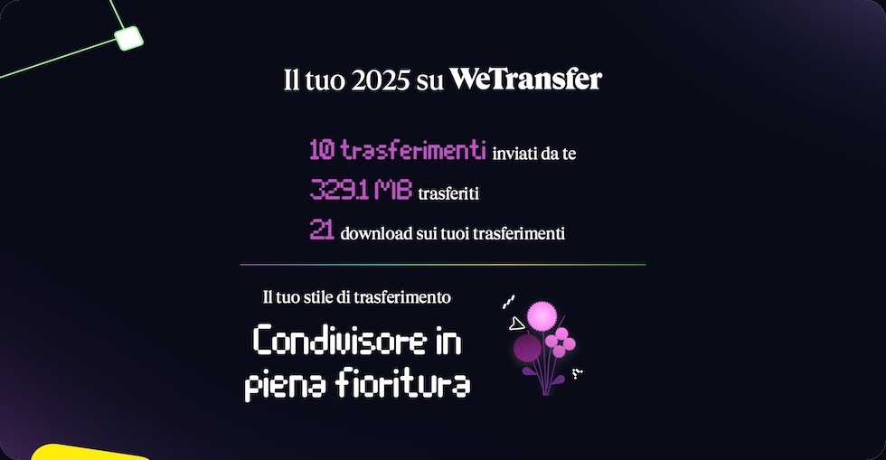 In altri casi, le attività riassunte sono semplicemente molto meno interessanti dei gusti musicali. È il caso, per esempio, di app come WeTransfer, un servizio online che permette di inviare file di grandi dimensioni senza bisogno di allegarli a un’email. Il riassunto dell’anno del servizio è stato piuttosto essenziale e freddo.
