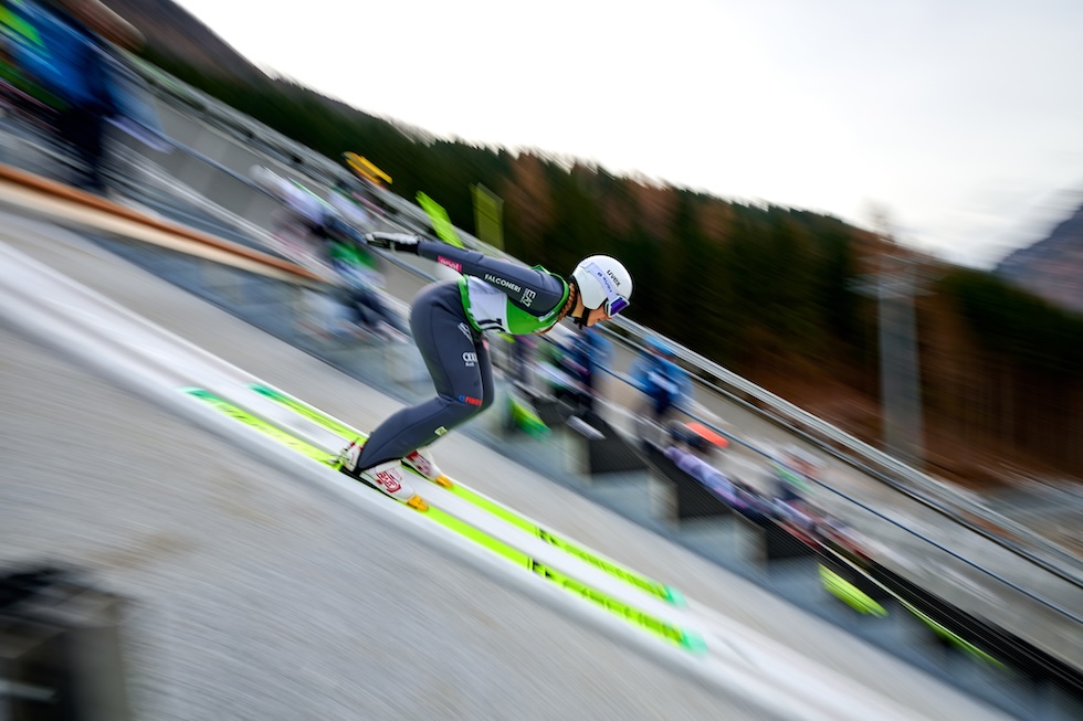 L’atleta italiana Anna Senoner al Predazzo Ski Jumping Stadium, 23 dicembre 2025 (Mattia Ozbot/Getty Images)