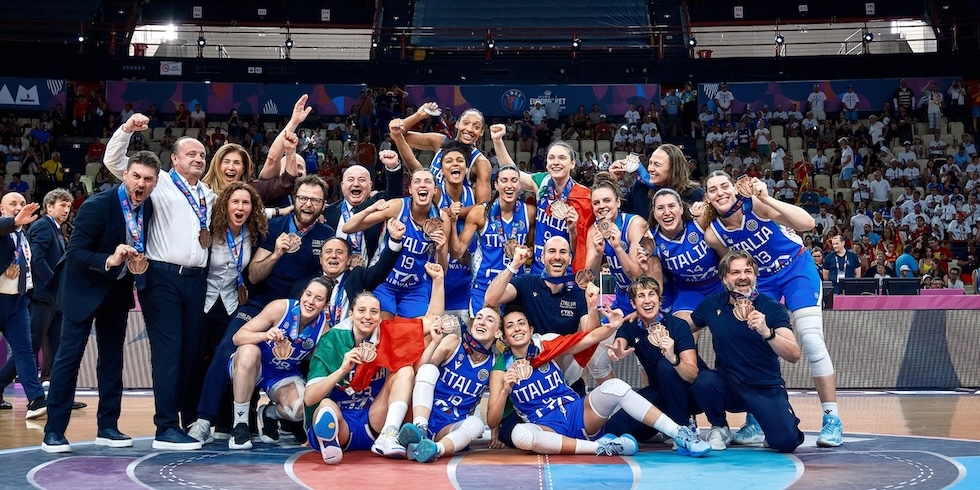 La Nazionale femminile di basket festeggia il bronzo vinto agli Europei del 2025 (dal profilo X della Nazionale italiana di basket)