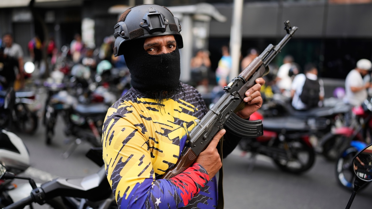 Due civili appartenenti a un colectivo fermano delle persone su uno scooter a Caracas, il 4 gennaio. (AP/Ariana Cubillos)