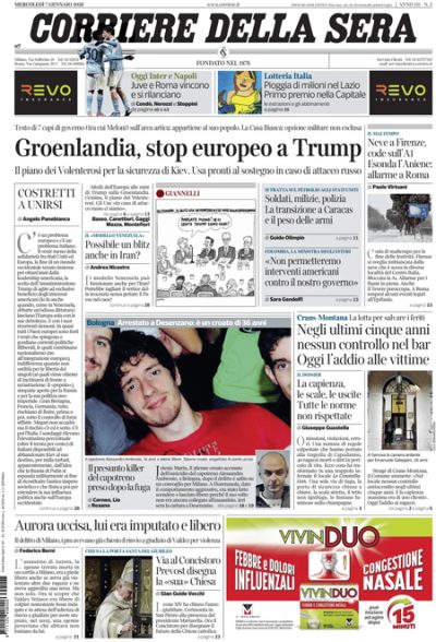 Le tre notizie principali in apertura sui giornali di oggi sono la dichiarazione dei leader dei principali paesi europei che hanno ribadito che la Groenlandia fa parte della Danimarca, rispondendo così alle parole del presidente degli Stati Uniti Trump sulla possibilità di annettere l’isola, la riunione a Parigi della cosiddetta “coalizione dei volenterosi” per parlare del futuro dell’Ucraina, e le indagini sull’incendio nel locale di Crans-Montana la notte di Capodanno in cui sono morte 40 persone. Il Fatto titola invece sui lavori per le prossime Olimpiadi invernali di Milano-Cortina, la Verità e il Tempo si occupano dell’uccisione di un capotreno a Bologna, e i giornali sportivi commentano la vittoria della Juventus nella partita di ieri sera per la Serie A maschile di calcio.