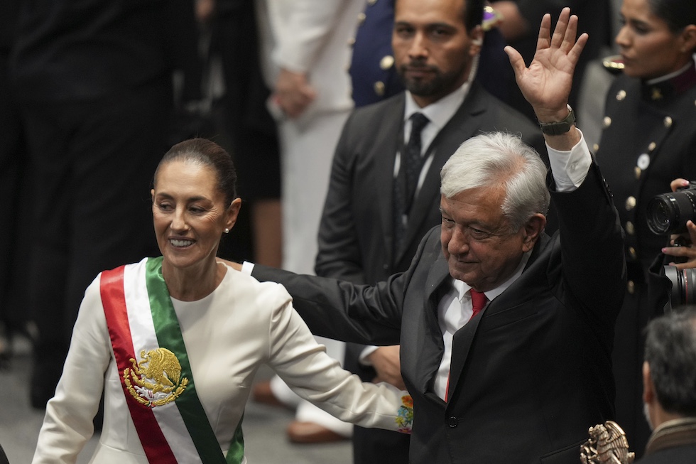 Il presidente uscente Andrés Manuel López Obrador con la sua successora Claudia Sheinbaum, a ottobre del 2024 (AP Photo/Fernando Llano)