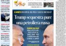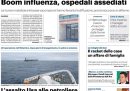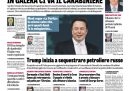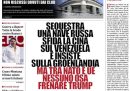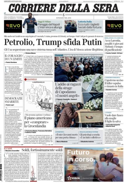 Il sequestro di una petroliera russa da parte degli Stati Uniti nell’oceano Atlantico e di una seconda petroliera nel mar dei Caraibi, accusate di far parte della cosiddetta “flotta fantasma” e di aggirare le sanzioni contro Russia, Iran e Venezuela, è la notizia in apertura sulla maggior parte dei giornali di oggi. Le altre notizie principali sulle prime pagine sono i funerali dei ragazzi italiani morti nell’incendio di Capodanno in un locale di Crans-Montana, in Svizzera, le discussioni sul futuro della Groenlandia dopo le minacce del presidente degli Stati Uniti Trump, e l’aggressione a Roma di quattro ragazzi dell’organizzazione giovanile di Fratelli d’Italia. I giornali sportivi si occupano delle partite giocate ieri per la Serie A maschile di calcio, con la vittoria dell’Inter che rimane in testa alla classifica.