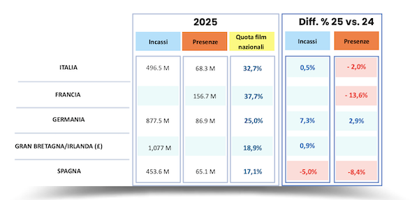 Di questa flessione americana è riuscito ad approfittare il cinema italiano, come si auspicava e anche più di quanto si credeva. La sua quota di mercato infatti non è salita solo come reazione al calo di quella americana. Se infatti si guarda agli altri paesi europei, che hanno sofferto della stessa mancanza, la compensazione non è stata come quella italiana. In Francia di solito i film francesi contano per circa il 40% del box office annuale, quest’anno invece hanno pesato per il 37% del totale e i biglietti venduti in generale sono calati del 13% rispetto al 2024. In Spagna (il mercato europeo più simile al nostro) gli incassi sono stati del 5% inferiori all’anno precedente e i film spagnoli hanno inciso per il 17%. In Germania, dove è stato un ottimo anno, gli incassi sono saliti del 7% e i film nazionali hanno inciso per un ragguardevole 25%.