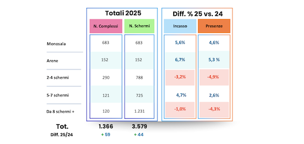 I dati Cinetel hanno rilevato inoltre che nel 2025 il numero di cinema in Italia, tra quelli che chiudono e quelli che aprono o riaprono, è aumentato di 59 unità, ma gli schermi solo di 44. Significa che hanno chiuso diversi multisala e molte aperture o riaperture sono state di monosala. I monosala inoltre sono il tipo di cinema che tende a programmare più film italiani. Nel 2025 l’incasso dei cinema monosala è quello che è cresciuto di più, del 5,6%, contribuendo al successo degli italiani (e sono cresciuti anche gli spazi di cinema all’aperto, per quanto incidano poco).