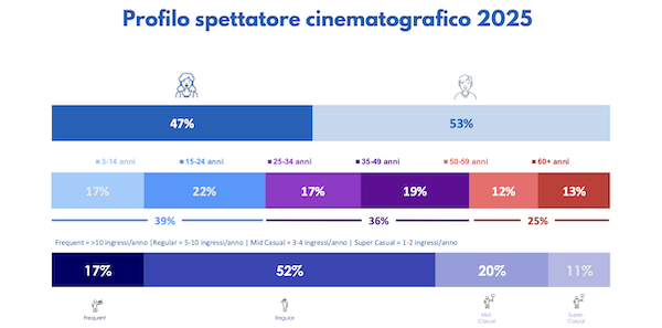 CinExpert (la parte di Cinetel che sonda chi frequenta i cinema e quanto) ha confermato anche che il pubblico giovane, quello tra i 18 e i 34 anni, continua a essere il più importante. Addirittura quello tra i 15 e i 24 anni è aumentato del 9% rispetto al 2024, quando già era molto cresciuto. Il dato è particolarmente significativo se si considera che questo è un tipo di pubblico attirato più che altro da grandi film americani, che quest’anno sono stati di meno.