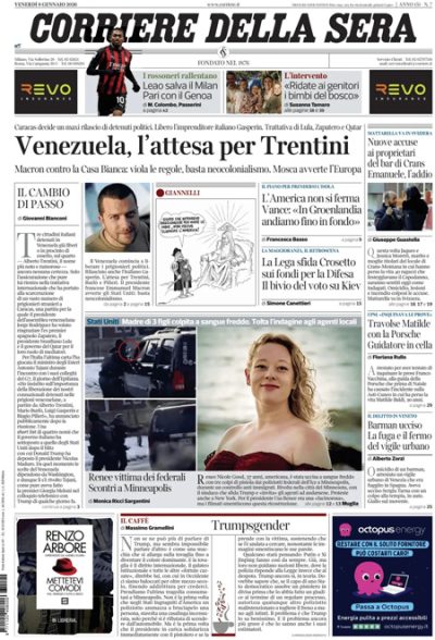 Ci sono notizie diverse in apertura sui giornali di oggi: molti si occupano della liberazione in Venezuela di alcuni prigionieri politici venezuelani e stranieri, e della speranza che siano liberati presto anche gli italiani detenuti fra i quali il cooperante Alberto Trentini, altri titolano sull’uccisione di una donna a Minneapolis, negli Stati Uniti, da parte di un agente dell’agenzia federale anti immigrazione, altri ancora sulle parole del presidente francese Macron che ha criticato la politica aggressiva del presidente degli Stati Uniti Trump. Il Fatto anticipa la data che sarebbe stata scelta dal governo per il referendum sulla riforma della giustizia, mentre il Riformista si occupa delle proteste contro il regime in Iran.