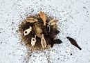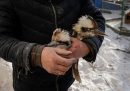 Uno scoiattolo riceve del cibo da una donna, mentre si sta avvicinando anche un uccellino, in un parco innevato di Kiev, Ucraina(REUTERS/Thomas Peter)