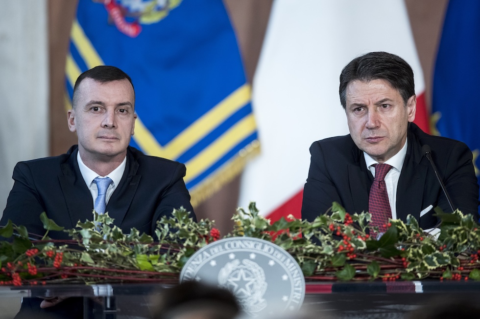 Rocco Casalino e Giuseppe Conte durante la conferenza stampa del 28 dicembre 2019, a Villa Madama (Roberto Monaldo/LaPresse)