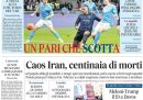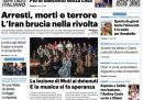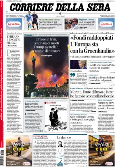 Su quasi tutti i giornali di oggi l’apertura è dedicata alle proteste contro il regime in Iran, represse violentemente dal governo, e alla minaccia del presidente degli Stati Uniti Trump di intervenire a sostegno delle proteste, a cui il regime iraniano ha risposto minacciando a sua volta di colpire gli Stati Uniti e Israele. Il Fatto e Libero aprono invece sul referendum sulla riforma della giustizia, mentre i giornali sportivi commentano il pareggio di ieri sera fra Inter e Napoli nella partita per il campionato di Serie A maschile di calcio.