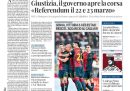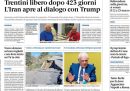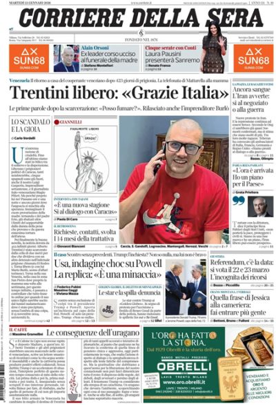 Sono tre le notizie principali su cui aprono i giornali di oggi: molti si occupano della liberazione da parte del Venezuela di due italiani, il cooperante Alberto Trentini e l’imprenditore Mario Burlò, dopo oltre un anno di detenzione, altri titolano sulla decisione del Consiglio dei ministri di fissare il referendum sulla riforma della giustizia per il 22 e il 23 marzo, altri ancora aprono sulle proteste contro il regime in Iran represse con violenza dal governo. Il Sole 24 Ore si occupa invece dell’indagine avviata dal dipartimento della Giustizia degli Stati Uniti contro il presidente della Federal Reserve Jerome Powell, mentre i giornali sportivi commentano la vittoria netta della Juventus contro la Cremonese nell’ultima partita della giornata del campionato di Serie A maschile di calcio.