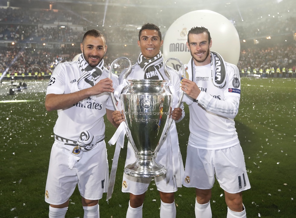 Gli ex calciatori del Real Madrid Karim Benzema, Cristiano Ronaldo e Gareth Bale – tra i più forti della loro epoca – dopo aver vinto Champions League del 2016, 29 maggio 2016 (Helios de la Rubia/Real Madrid via Getty Images)