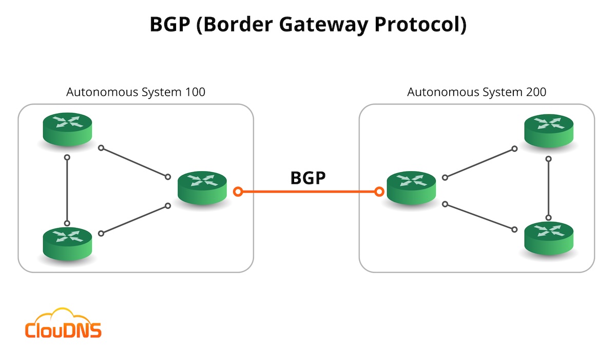 Rappresentazione schematica di due sistemi autonomi (le isole) e di un BGP che permette di trovare la strada tra le due per i dati (ClouDNS)