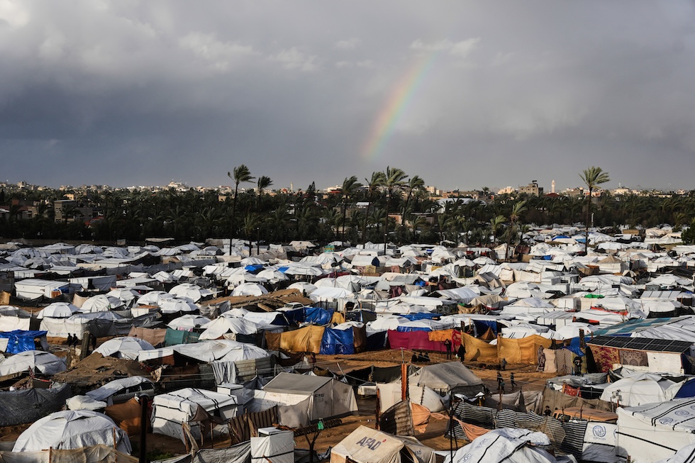 L’arcobaleno sulle tende per sfollati a Deir al Balah, nella Striscia di Gaza, il 13 gennaio 2026 (AP Photo/Abdel Kareem Hana)