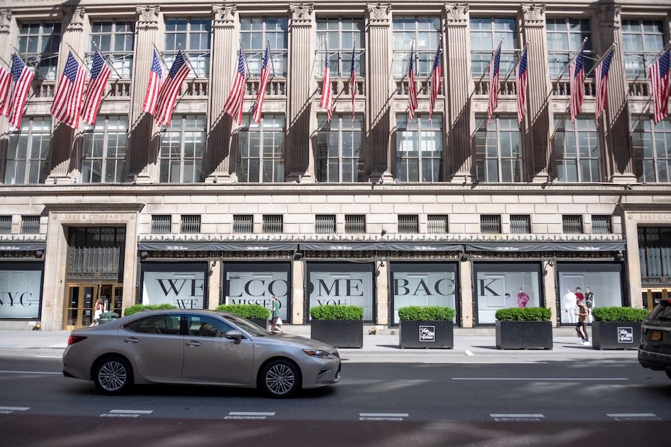 Un messaggio di bentornato esposto nelle vetrine di Saks Fifth Avenue in occasione della riapertura di giugno 2020, dopo la prima ondata durante la pandemia da Covid-19 (Alexi Rosenfeld/Getty Images)