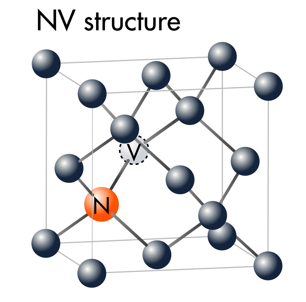 Ci sono diversi tipi di centri di colore, ma quello che interessa per le applicazioni quantistiche è il cosiddetto “centro azoto-lacuna” o NV, dal simbolo dell’azoto N e dalla prima lettera della parola inglese “vacancy”, cioè “posto vacante, lacuna”. Il centro NV è un difetto specifico all’interno del reticolo del diamante ed è inferiore al nanometro, cioè un milionesimo di millimetro. Come suggerisce appunto il nome, è formato da un atomo di azoto che ha preso il posto di uno di carbonio e da un’area adiacente che è rimasta vuota, cioè priva di un atomo di carbonio nel reticolo che forma il diamante.