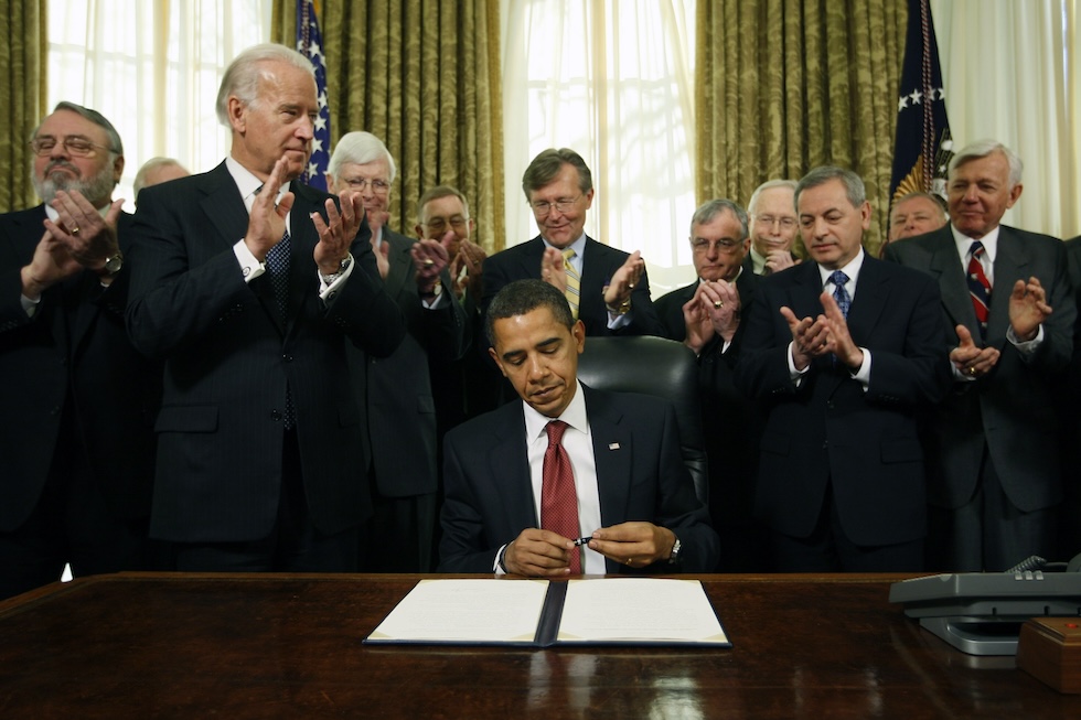 Il presidente Barack Obama firma l’ordine esecutivo col quale intendeva chiudere Guantanamo, 22 gennaio 2009 (AP Photo/Charles Dharapak)