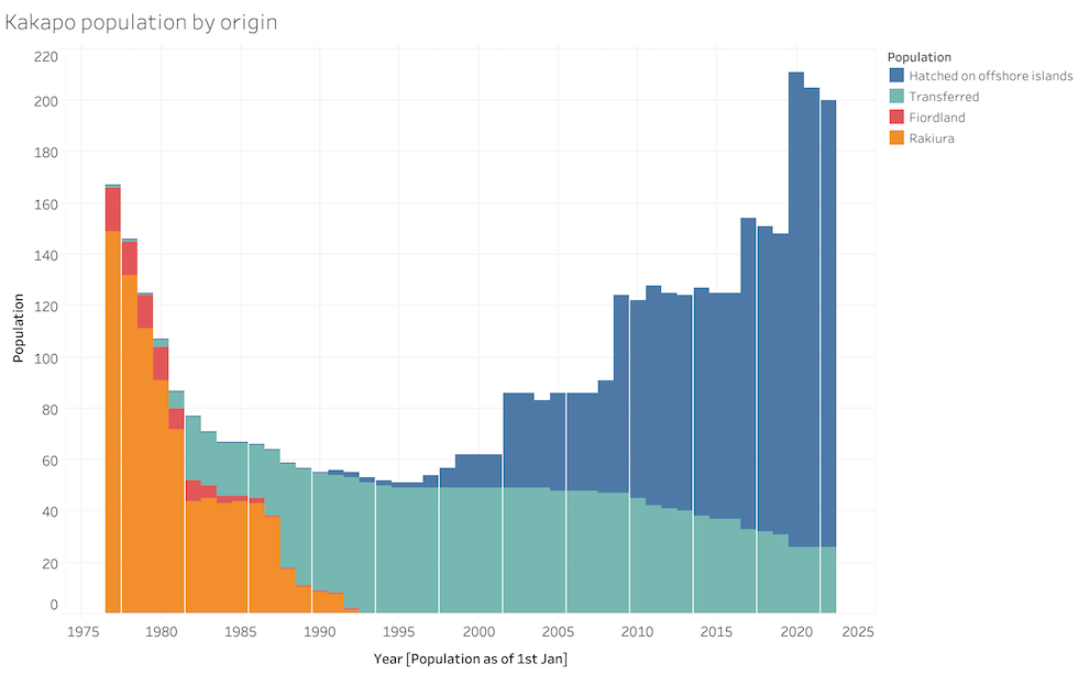 L’andamento della popolazione di cacapò (dipartimento per la Conservazione della Nuova Zelanda)