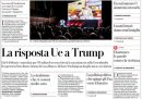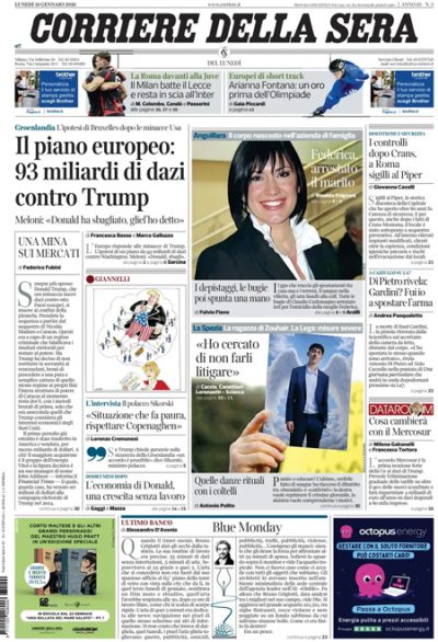 La tensione tra Stati Uniti e Unione Europea per le minacce del presidente statunitense Donald Trump di annettere la Groenlandia è la notizia in apertura su quasi tutti i giornali di oggi: dopo l’annuncio di Trump di dazi del 10 per cento verso i paesi che avevano mandato militari in Groenlandia, ieri l’Unione Europea ha risposto ipotizzando di imporre a sua volta dazi nei confronti degli Stati Uniti, sui quali però non c’è ancora un accordo fra tutti i paesi europei. Le altre notizie principali sulle prime pagine sono il ritrovamento del corpo di Federica Torzullo, la donna scomparsa l’8 gennaio a Anguillara Sabazia, vicino a Roma, e l’arresto del marito accusato dell’omicidio; le indagini e le reazioni all’uccisione con un coltello di un ragazzo a scuola a La Spezia da parte di un compagno; il referendum sulla giustizia; e la chiusura del Piper, una nota discoteca di Roma, dopo i controlli sulla sicurezza del locale.