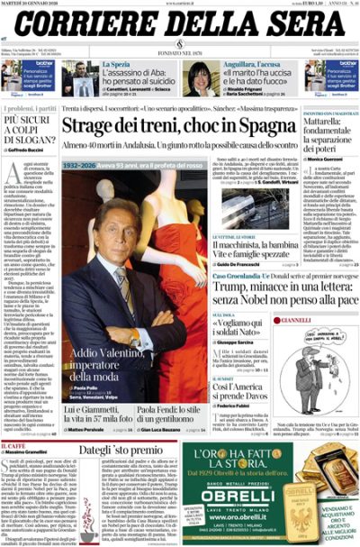 Il confronto fra Stati Uniti e Unione Europea sulla Groenlandia, la morte di Valentino Garavani, e l'incidente ferroviario in Spagna