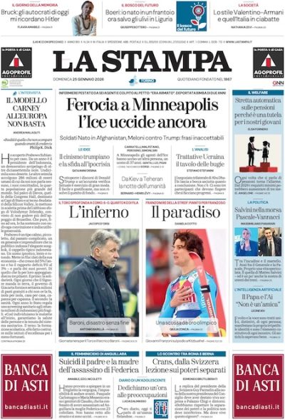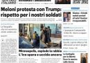 Ci sono tre grosse notizie che occupano gran parte dello spazio un po’ su tutte le prime pagine dei quotidiani generalisti. La prima è l’uccisione di un’altra persona a Minneapolis, in Minnesota, da parte di agenti federali degli Stati Uniti, dopo quella del 7 gennaio (quella volta era stato un agente dell’ICE, l’agenzia anti-immigrazione, questa volta un agente della polizia di frontiera). Poi c’è la decisione del governo italiano di richiamare l’ambasciatore italiano in Svizzera, come gesto di protesta verso la Svizzera stessa – molto irrituale per la verità – per la scarcerazione di Jacques Moretti, il proprietario del locale Le Constellation di Crans-Montana in cui è avvenuto il grave incendio di Capodanno. E infine si parla dell’ultimo sviluppo di una storia di cronaca molto seguita in questi giorni: ad Anguillara Sabazia, in provincia di Roma, sono stati trovati morti impiccati i genitori di Claudio Carlomagno, l’uomo che pochi giorni fa aveva confessato di aver ucciso la moglie Federica Torzullo.