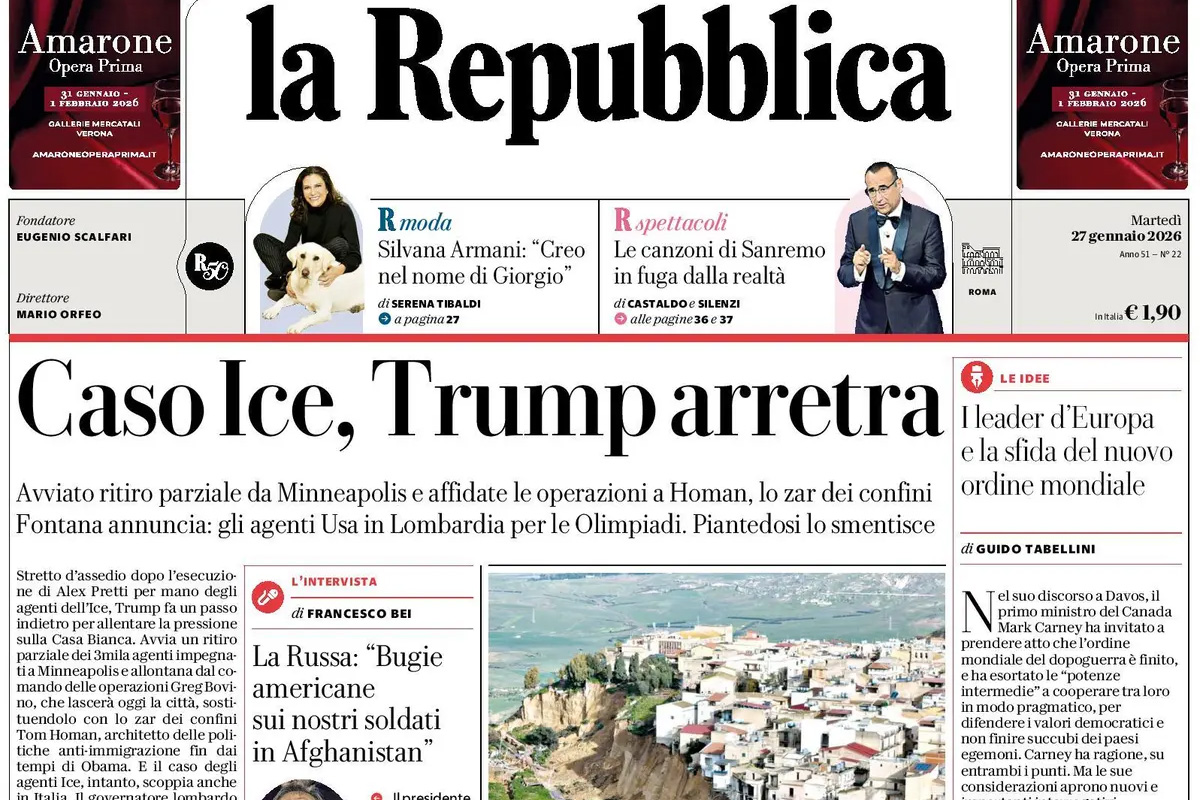 Ci sono notizie diverse in apertura sui giornali di oggi: molti si occupano delle violenze delle forze di polizia nelle operazioni anti-immigrazione a Minneapolis e del loro parziale ritiro annunciato dal presidente degli Stati Uniti Trump, altri aprono sul giorno della Memoria, celebrato oggi, in cui si ricordano le vittime dell’Olocausto, del nazismo e del fascismo, altri ancora titolano sull’uccisione di un uomo a Milano da parte di un agente di polizia. Il Messaggero apre invece sul ritiro dell’ambasciatore italiano in Svizzera deciso dal governo come protesta per la scarcerazione del proprietario del locale di Crans-Montana in cui sono morte 40 persone nell’incendio di Capodanno, il Fatto si occupa delle forze di sicurezza straniere che saranno in Italia durante le Olimpiadi di Milano Cortina, e la Verità critica la posizione del capo dell’assemblea dei vescovi italiani Zuppi sull’autonomia e l’indipendenza della magistratura.