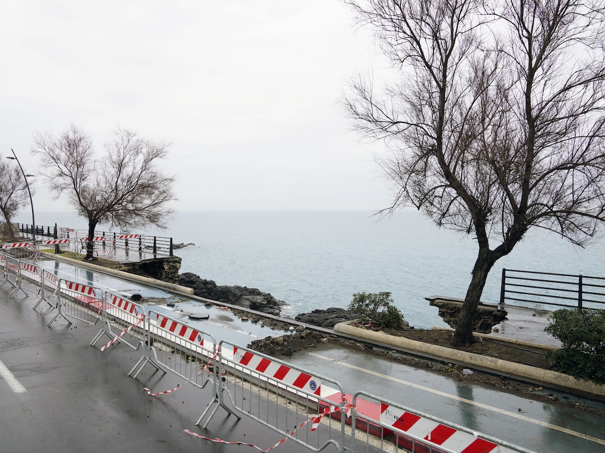 A Santa Teresa di Riva la mareggiata ha prodotto i suoi effetti più impressionanti: interi tratti di strada sono stati spazzati via dalle onde. 28 gennaio (Alessandro Sala, CESURA, per il Post)