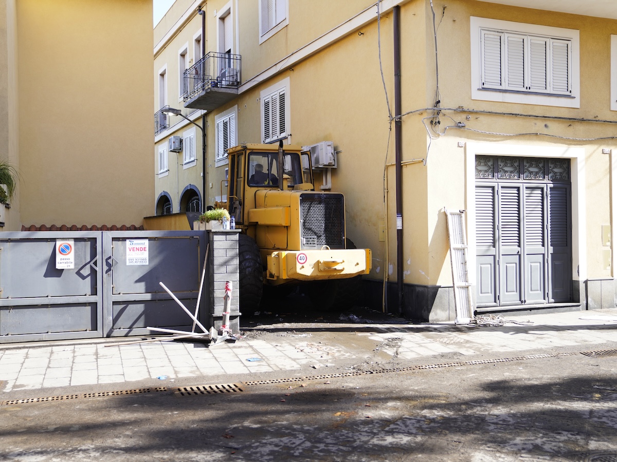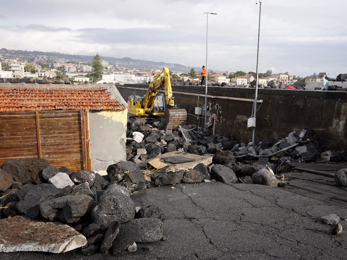 Ad Aci Trezza il mare ha invaso le strade del borgo. La mareggiata ha distrutto i banchi del mercato del pesce e devastato i pianterreni, i piani interrati e alcuni garage costruiti sotto il livello della strada. Alcuni operai stanno ripulendo Villa Fortuna, di fronte ai faraglioni, dove c’erano un ufficio di informazioni turistiche e un ecomuseo. Davanti a un palazzo sventrato dalle onde ci sono lavori in corso. Tra le macerie, vicino a un cartello che pubblicizza b&b e case vacanza, qualcuno ha piantato una bandiera tricolore e ha affisso un cartello con un QR code e la scritta «aiutateci a rialzarci».
