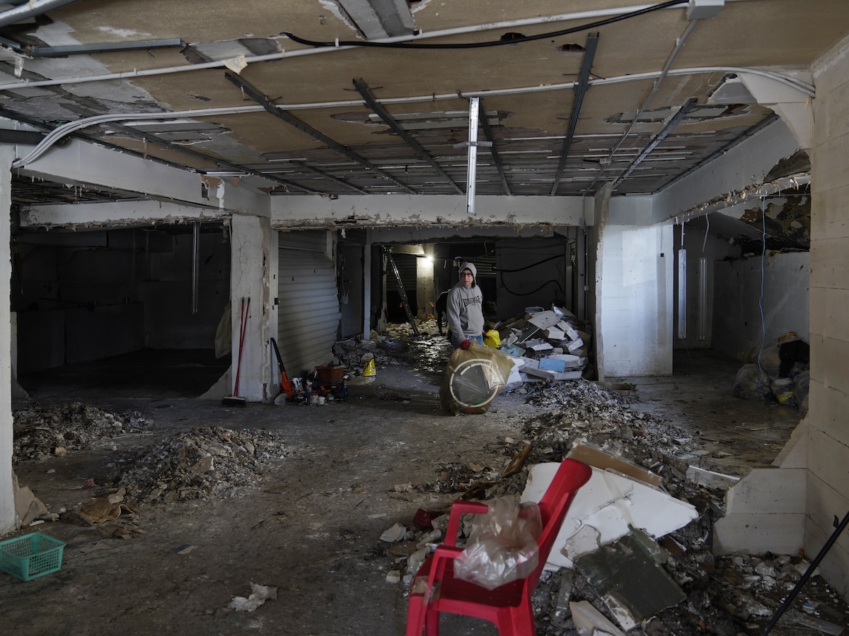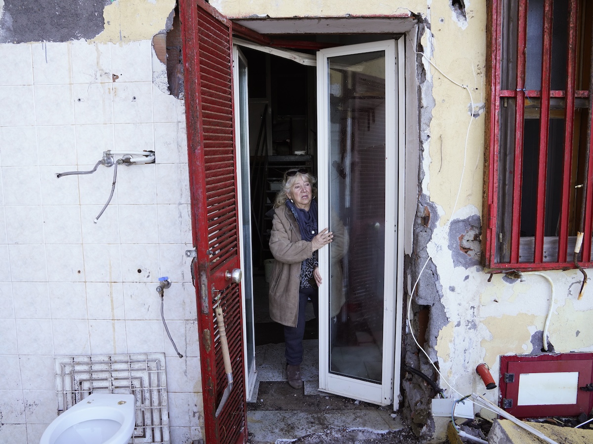 Francesca Macrì nella sua casa danneggiata a Riposto. Ci abitava da trent’anni, con suo figlio e il compagno. Ha un ingresso condiviso con un’altra abitazione, anch’essa distrutta, una cucina buia da cui si accede a una piccola camera da letto con un soppalco metallico, dove sono poggiati i letti. Il bagno era stato ricavato su un terrazzino all’esterno: è stato distrutto dalle onde ed è rimasta solo la tazza. Macrì dice che non è riuscita a salvare nulla perché è dovuta scappare di corsa. Dice che era abituata ad avere il mare mosso alle porte di casa, ma non si aspettava una mareggiata come questa. Ora lei, il figlio e il compagno hanno trovato ospitalità da parenti, separatamente. 28 gennaio (Alessandro Sala, CESURA, per il Post)