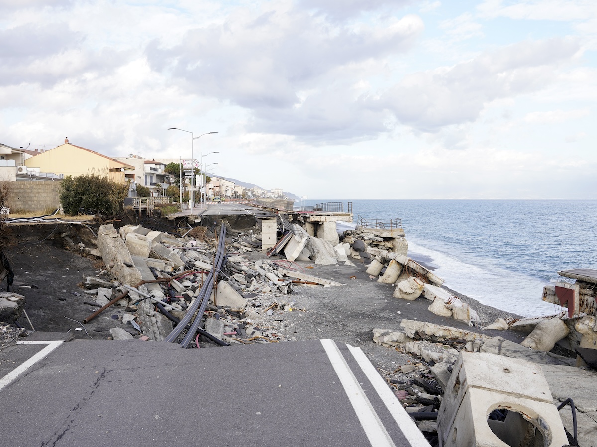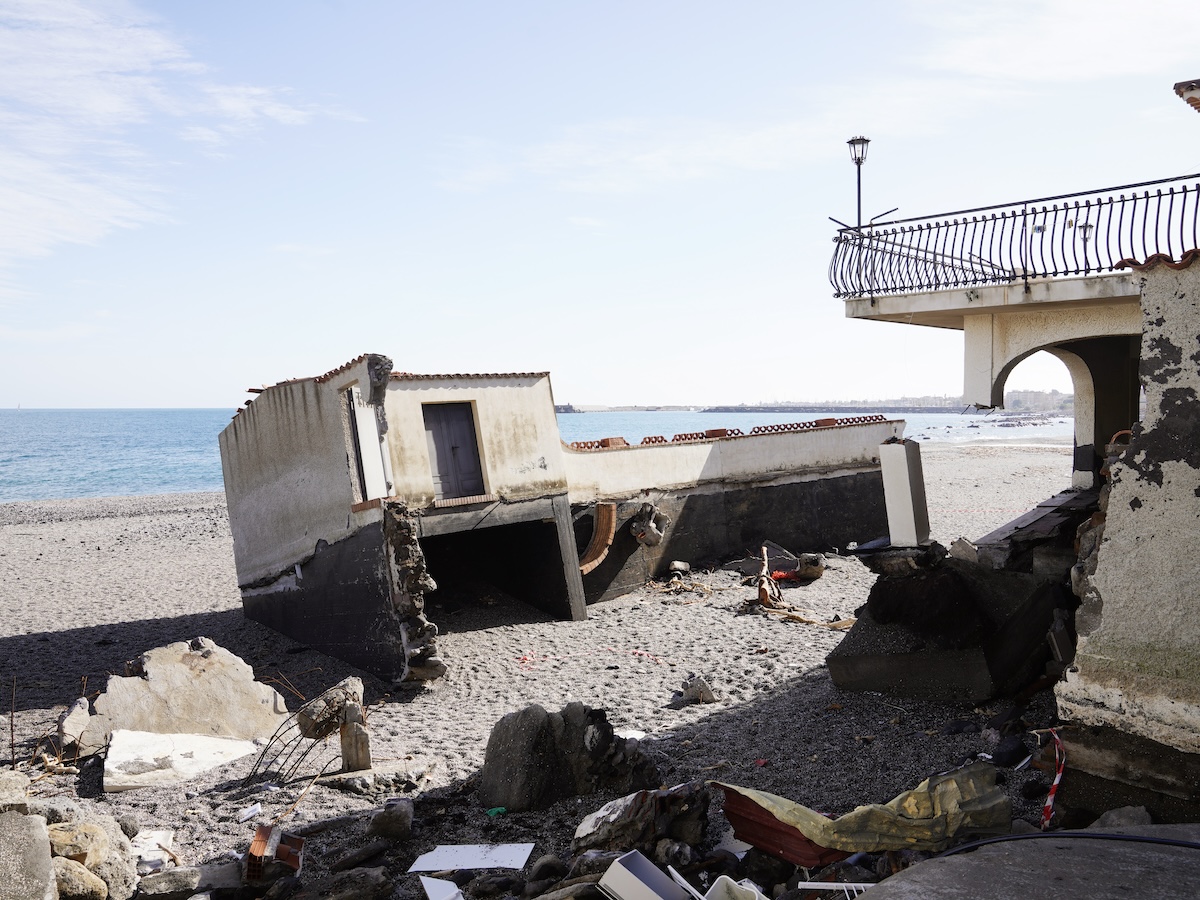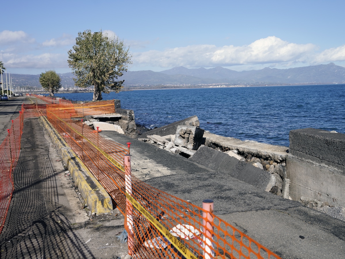 All’imbocco del lungomare di Santa Teresa di Riva un cartello dice che la spiaggia e il lungomare appena rifatto sono “bandiera blu”, un riconoscimento che una fondazione internazionale assegna alle spiagge con maggiore attenzione verso l’ambiente. C’è una foto del lungomare e la scritta «voi siete qui». Il lungomare però non c’è più: la mareggiata ha divelto la pista ciclabile, si è portata via la strada e ha spostato interi pilastri di cemento armato, che ora sono disseminati lungo la spiaggia. Una fermata del bus è stata divelta, ci sono voragini ovunque e una rotonda sul mare è sprofondata. Solo alcuni alberi piantati lungo la strada hanno resistito alle onde.