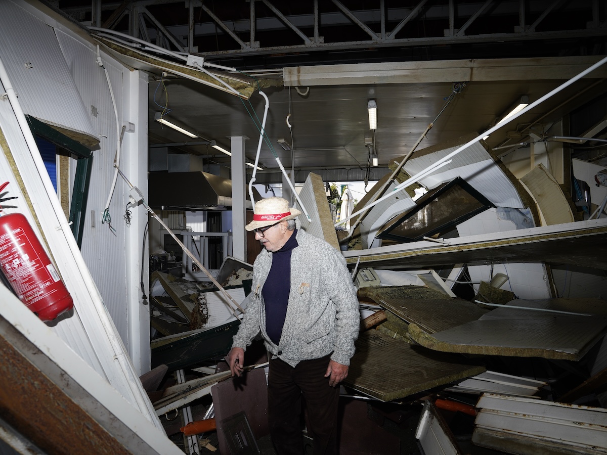 Agatino Caruso (detto Tino), nel ristorante distrutto del lido Tobogan, 28 gennaio. Visto che nel 2027 la sua concessione dovrebbe essere messa a gara, dice che non sa se gli conviene risistemare lo stabilimento, cosa che in realtà sta facendo. Nel frattempo sta ricevendo chiamate da clienti anche stranieri che vogliono contribuire per pagare i lavori di ristrutturazione  (Alessandro Sala, CESURA, per il Post)