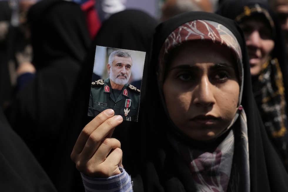 In una manifestazione a favore del governo una donna mostra una foto del comandante delle forze aeree dei Guardiani della rivoluzione, Amir Ali Hajizadeh, ucciso negli attacchi israeliani di giugno 2025 (AP Photo/Vahid Salemi)