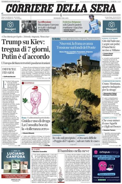 Sono due le notizie principali su cui aprono i giornali di oggi: l’annuncio del presidente degli Stati Uniti Trump, non confermato ancora dalla Russia, di una sospensione dei bombardamenti sulle città ucraine per una settimana in vista dei giorni di grande freddo previsti, in quella che quasi tutti i titoli definiscono la “tregua del gelo”, e la frana di Niscemi, con le discussioni fra i partiti su dove trovare i finanziamenti per gli aiuti alle zone colpite dal ciclone Harry. Il Manifesto e Avvenire titolano invece sulla conferma da parte dell’esercito israeliano del conteggio del ministero della Salute della Striscia di Gaza delle persone palestinesi uccise in due anni di guerra, più di settantamila.