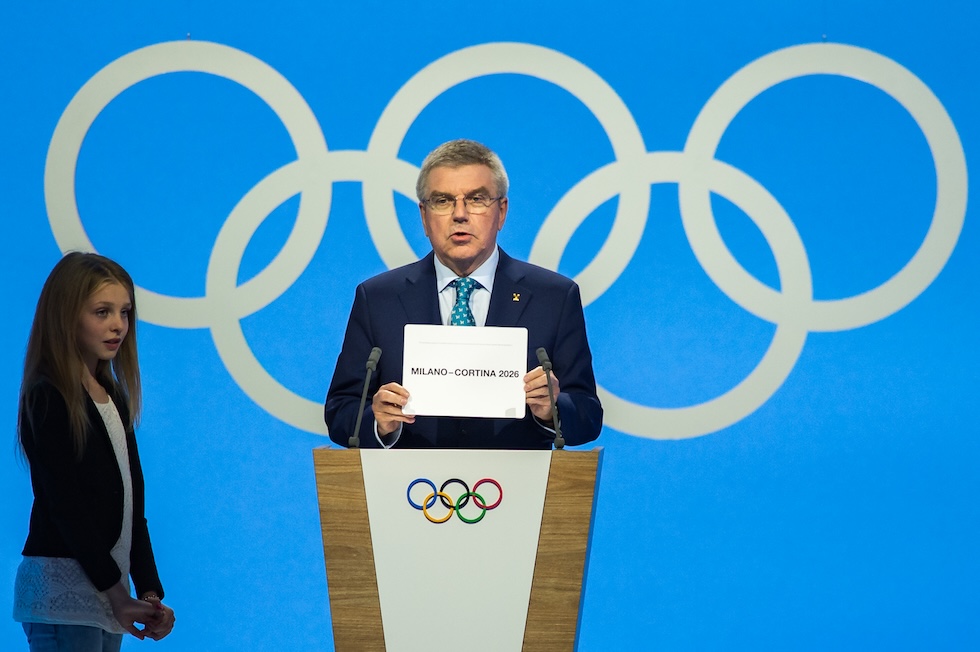 Il presidente del Comitato olimpico internazionale Thomas Bach annuncia l’assegnazione delle Olimpiadi invernali 2026 a Milano Cortina, Losanna, Svizzera, 24 giugno 2019 (Robert Hradil/Getty Images)