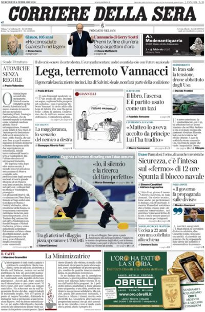 Sono tre le notizie principali in apertura sui giornali di oggi: molti si occupano della decisione del vicesegretario della Lega Vannacci di abbandonare il partito per fondarne uno proprio, altri titolano sulle discussioni nella maggioranza sui contenuti delle nuove norme sulla sicurezza e sullo spostamento a domani del Consiglio dei ministri che dovrebbe approvarle, altri ancora aprono sull’informativa in parlamento del ministro dell’Interno Piantedosi sugli scontri durante la manifestazione di sabato scorso a Torino, nella quale ha accusato i partiti di sinistra di connivenza con i violenti. Il Sole 24 Ore titola invece sui danni provocati dal ciclone Harry in Sicilia, Calabria e Sardegna e sul ritardo nell’approvazione di aiuti per le imprese danneggiate, mentre i giornali sportivi commentano la vittoria contro il Bologna del Milan, che conferma il secondo posto in classifica nel campionato di Serie A maschile di calcio.