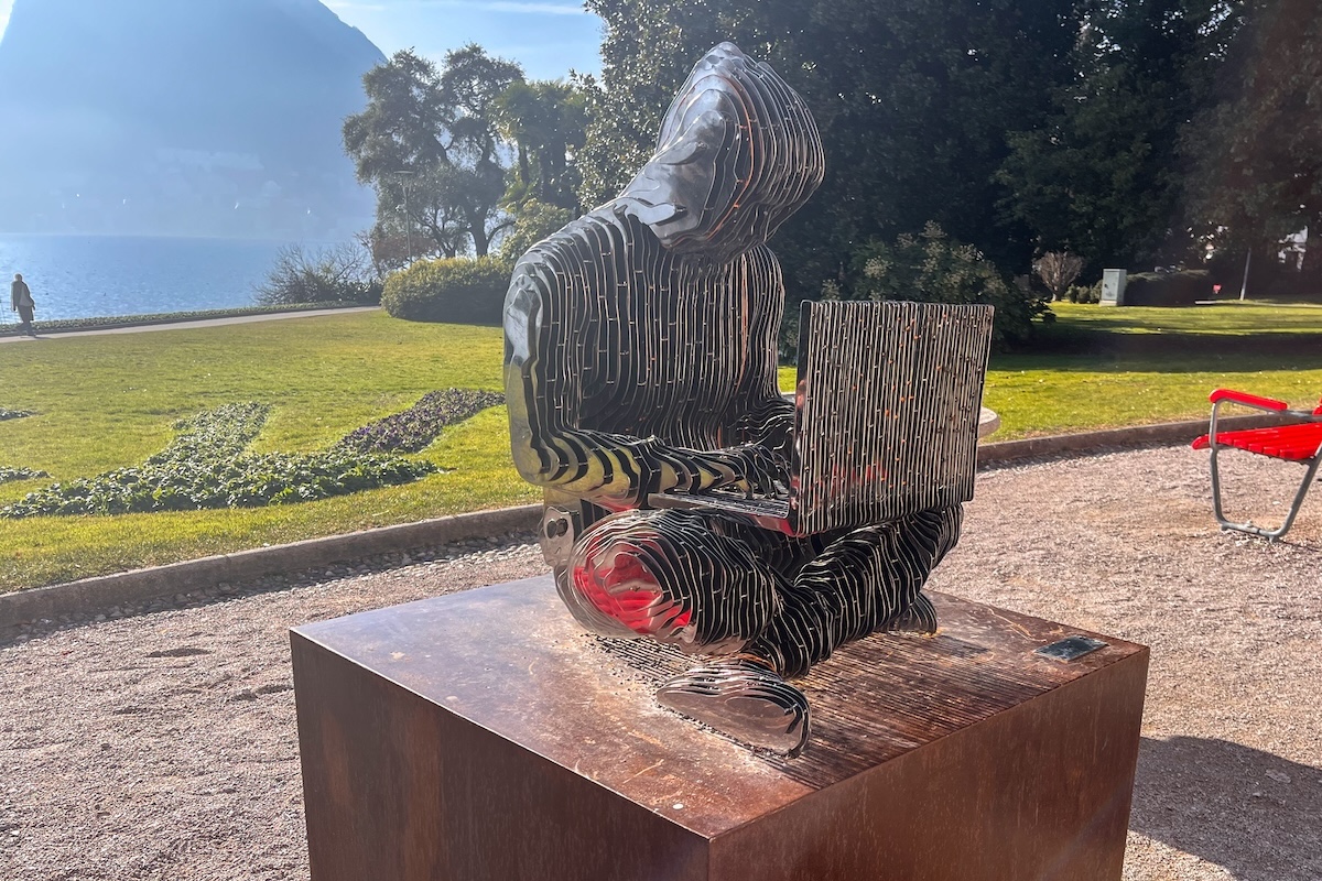 La statua del creatore dei Bitcoin, Satoshi Nakamoto, Lugano, 21 gennaio 2026 (Mariasole Lisciandro/il Post)