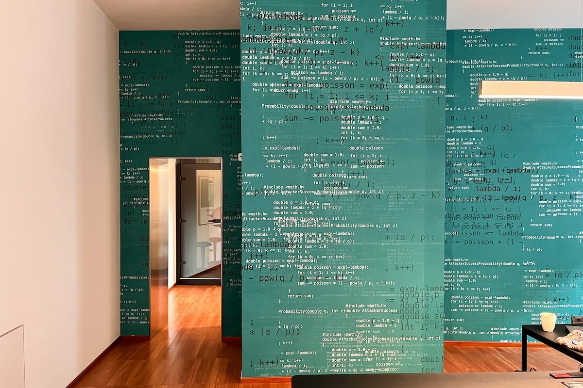 All’interno un po’ ovunque ci sono richiami al mondo delle criptovalute: interi muri tempestati di codici, una gigantografia del paper con cui furono ideati i Bitcoin, e richiami continui al progetto dei Bitcoin a El Salvador (di cui peraltro Zucco è console onorario in Svizzera proprio per il suo ruolo all’interno della fondazione).