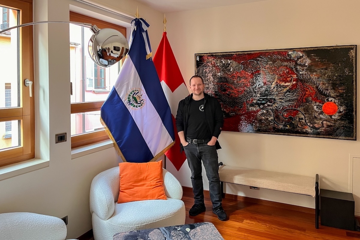 Giacomo Zucco, vice presidente di Plan ₿ e con accanto le bandiere della Svizzera e di El Salvador, Lugano, 21 gennaio 2026 (Mariasole Lisciandro/il Post)