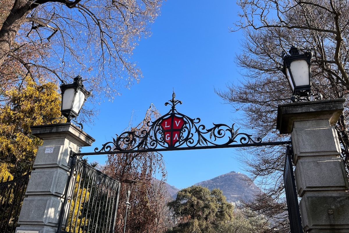 Lo stemma sul cancello all’entrata di un parco a Lugano, 21 gennaio 2026 (Mariasole Lisciandro/il Post)