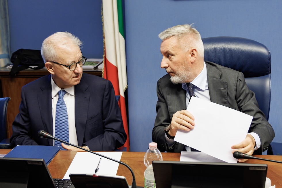 Il sottosegretario alla presidenza del Consiglio Alfredo Mantovano con delega ai servizi segreti, a sinistra, durante l’audizione al Copasir, presieduto da Lorenzo Guerini del PD, a destra, il 5 agosto 2025 (Roberto Monaldo/LaPresse)