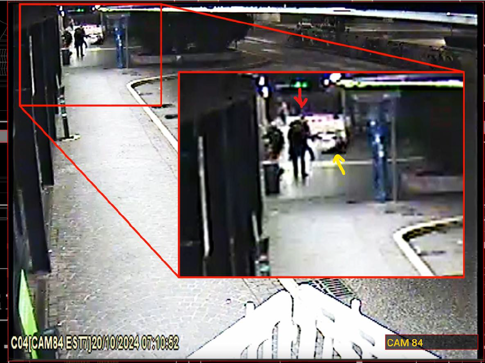 Frame dalle videocamere di sorveglianza della stazione: con la freccia gialla è indicato Moussa Diarra un attimo prima di venire colpito dal colpo di pistola e con la freccia rossa è indicato l’indagato.