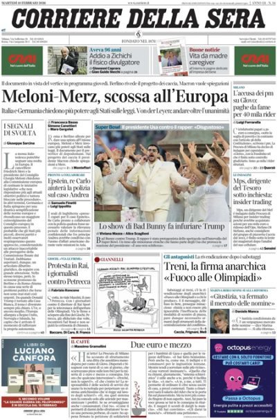 Ci sono molte notizie diverse in apertura sui giornali di oggi: l’incontro informale fra i capi di stato e di governo dei paesi dell’Unione Europea in programma giovedì sul tema della competitività dell’Europa, le polemiche sulla Rai dopo la disastrosa telecronaca della cerimonia inaugurale delle Olimpiadi del direttore di Rai Sport Petrecca, l’indagine della procura di Milano che ha messo sotto controllo giudiziario Foodinho srl, la società che gestisce le consegne di Glovo, il referendum sulla riforma della giustizia in programma il 22 e il 23 marzo, il rinvio a giudizio di Maria Rosaria Boccia, accusata di stalking, lesioni e interferenze illecite nei confronti dell’ex ministro della Cultura Sangiuliano, e ancora la questione “sicurezza” dopo gli scontri durante le manifestazioni e il presunto sabotaggio alle linee ferroviarie. Repubblica non esce per lo sciopero dei giornalisti che protestano contro le trattative per la vendita del giornale.