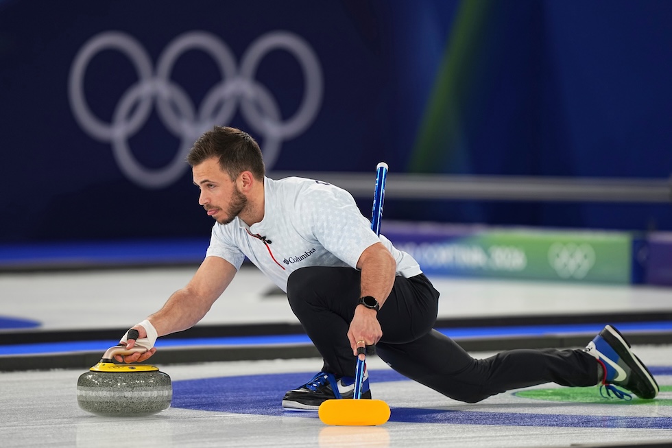 L’americano Korey Dropkin mentre tira una stone a Cortina D’Ampezzo, 10 febbraio 2026 (AP Photo/Fatima Shbair)