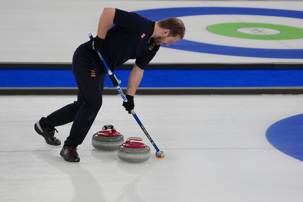 Lo svedese Rasmus Wranaa mentre spazza il ghiaccio a Cortina D’Ampezzo, 10 febbraio 2026 (AP Photo/Misper Apawu)