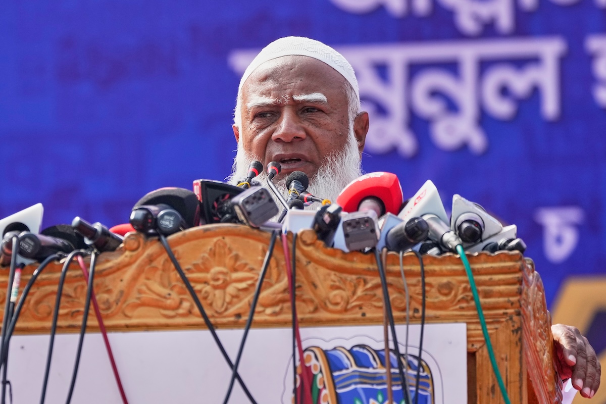 Shafiqur Rahman, leader del Jamaat-e-Islami, durante un evento della campagna elettorale a Dacca, il 9 febbraio del 2026 (AP Photo/Anupam Nath)
