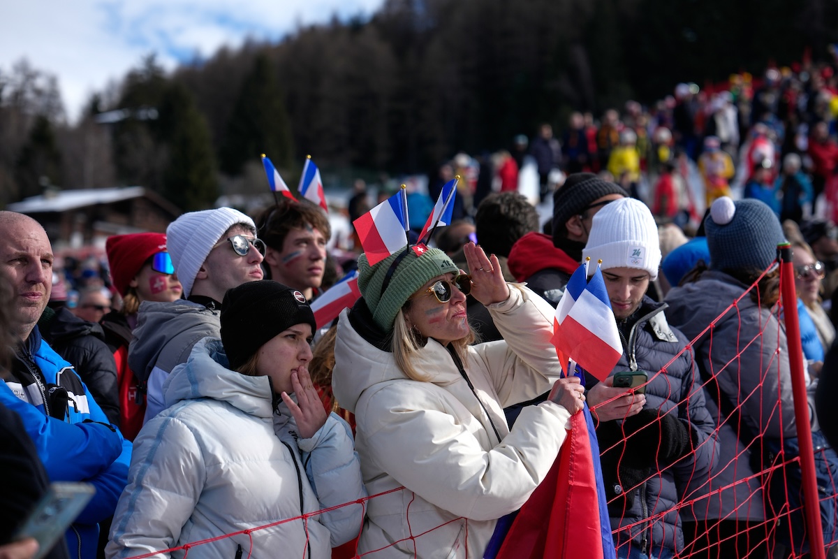 Tifose francesi guardano la gara maschile di discesa libera a Bormio, 7 febbraio 2026 (AP Photo/John Locher)