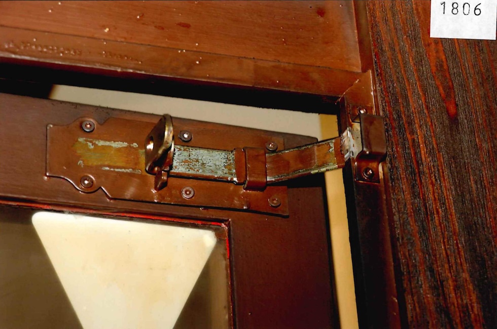 Il chiavistello della porta che la sera dell’incendio era chiusa e poi è stata forzata dai soccorritori (procura di Sion via ANSA)