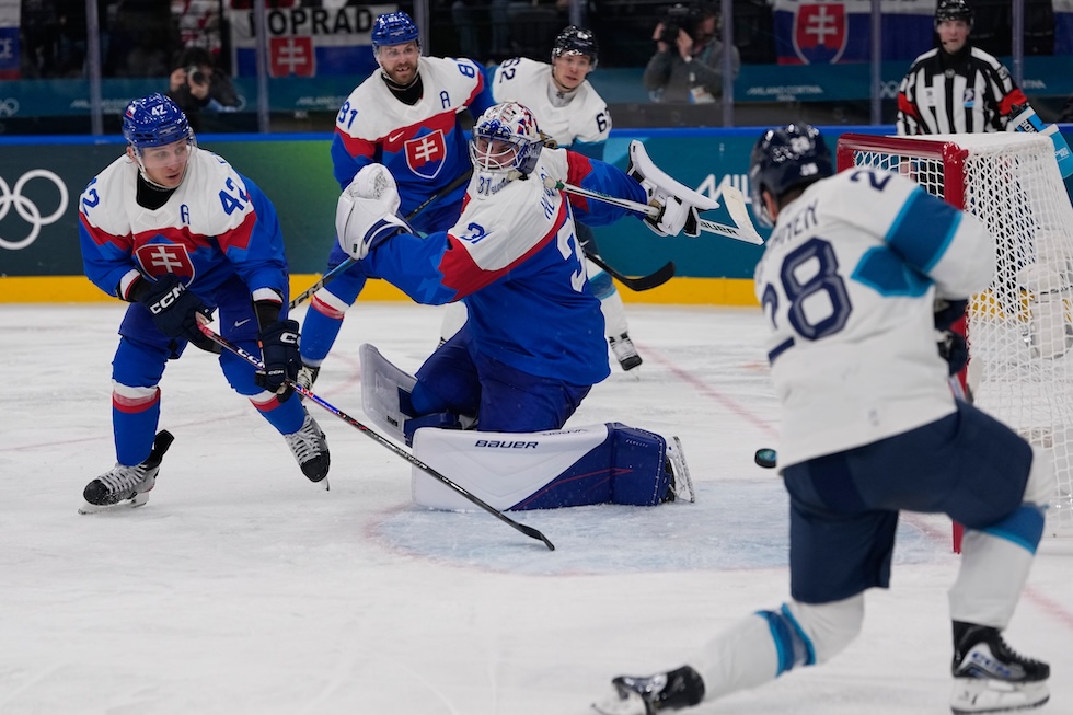 Il finlandese Niko Mikkola cerca di controllare il disco durante la partita Slovacchia-Finlandia a Milano, 11 febbraio 2026 (AP Photo/Petr David Josek)